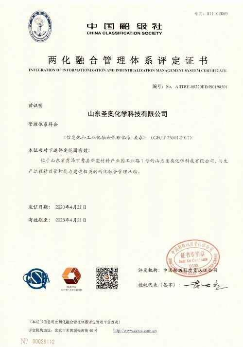 4月21日,中化国际下属山东圣奥正式通过国家工业和信息化部《信息化和工业化融合管理体系要求》(GB/T 23001-2017)体系认证,标志着山东圣奥在推进信息化和工业化深度融合方面进入新阶段,这是继安徽圣奥2018年9月入选之后,中化国际下属圣奥化学旗下第二家子公司成功通过国家两化融合管理体系认证。